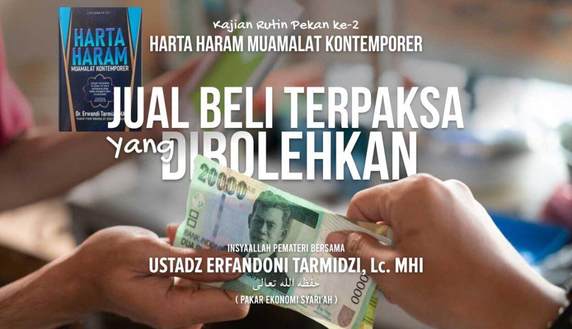 Dalam Kitab Harta Haram Muamalat Kontemporer karya Dr. Erwandi Tarmizi, MA Jual beli yang dibolehkan. Pada dasarnya jual beli terpaksa hukumnya tidak boleh dan tidak sah, namun dalam kondisi tertentu jual beli terpaksa dibolehkan syari’at.