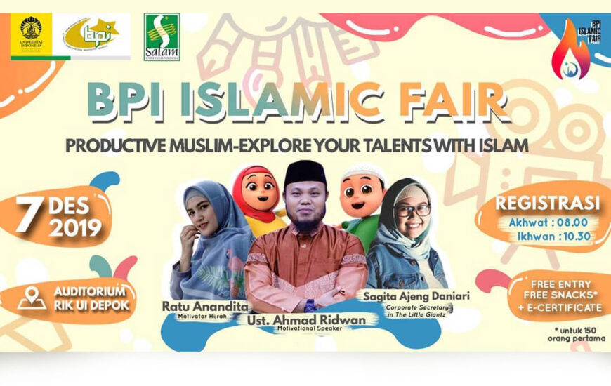 The Islamic Studies Agency FKG UI presents BPI ISLAMIC FAIR 2019 PRODUCTIVE MUSLIM-EXPLORE YOUR TALENTS WITH ISLAM 7 December 2019 – RIK UI Depok Auditorium – Great Muslim Studies with the theme: Creative Muslimah Full of Positive Works Ratu Anandita – Film Review...