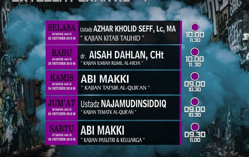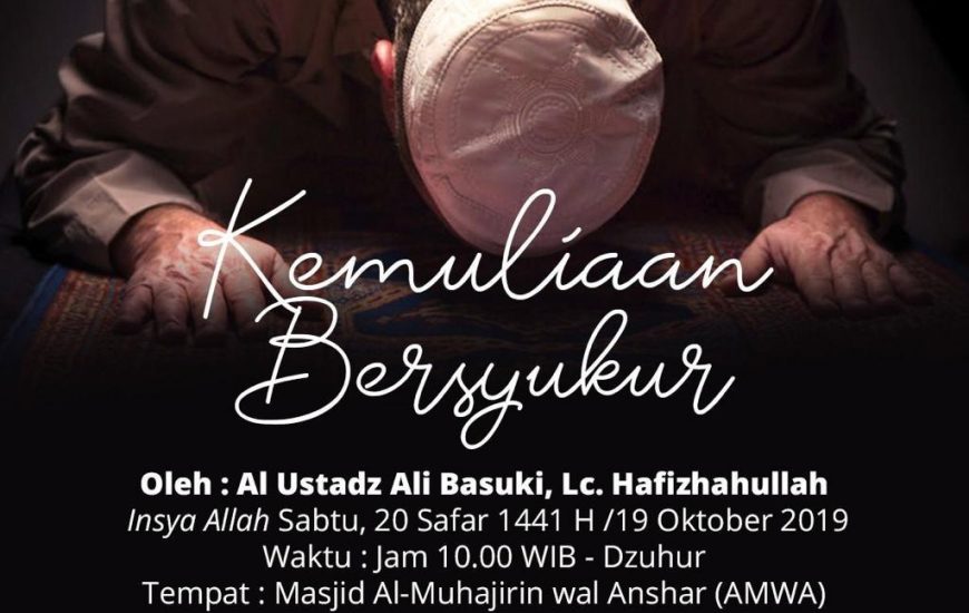 Come, scientific Islamic studies. The Glory of Grateful by Al Ustadz Ali Basuki, Lc. Hafizhahullah God willing, Saturday, 20 Safar 1441 H/19 October 2019 10:00 a.m. – Zuhur at Al-Muhajirin wal Ansar Mosque (AMWA)