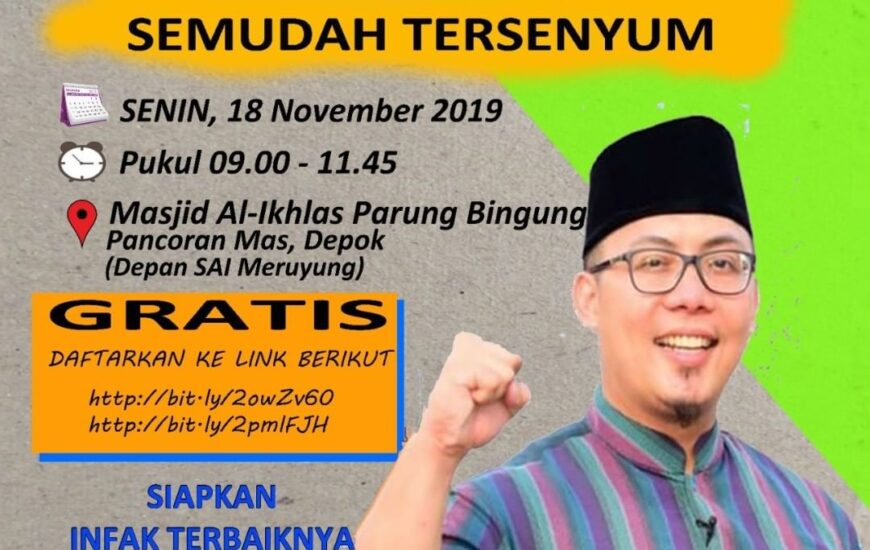 Islamic Studies with the Theme: MEMORY OF THE QUR'AN IS EASY TO SMILE Together: Ustad Bobby Herwibowo Monday, 18 November 2019 09.00 – 11.45 WIB Al-Ikhlas Mosque Parung Confused Pancoran Mas, Depok (Front of SAI Meruyung) FREE FOR THE PUBLIC
