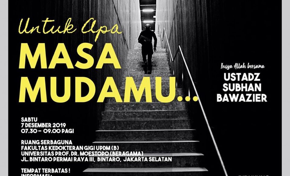Road2Jannah Study for Brothers & Sisters Road2Jannah – FKG Moestopo held a study WHAT IS YOUR YOUNG TIME FOR? Insha Allah together USTADZ SUBHAN BAWAZIER Saturday 7 December 2019 07.30 – 09.00 wib Multipurpose Room Faculty of Medicine Gigi UPDM (B) Prof.DR University....