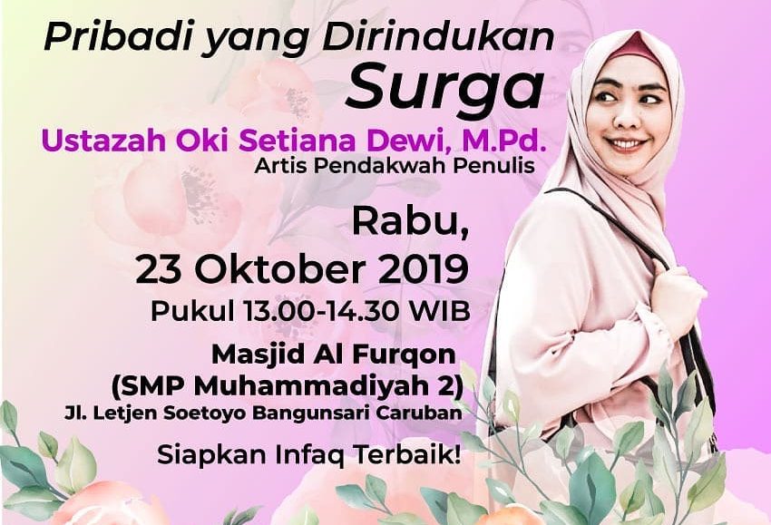 The Person Who Longs for Heaven With Ustazah Oki Setiana Dewi , M.Pd. Wednesday 23 October 2019 13:00 – 14:30 Al Furqon Mosque (SMP Muhammdiyah 2) Jl.Letjen Soetoyo Bangunsari Caruban