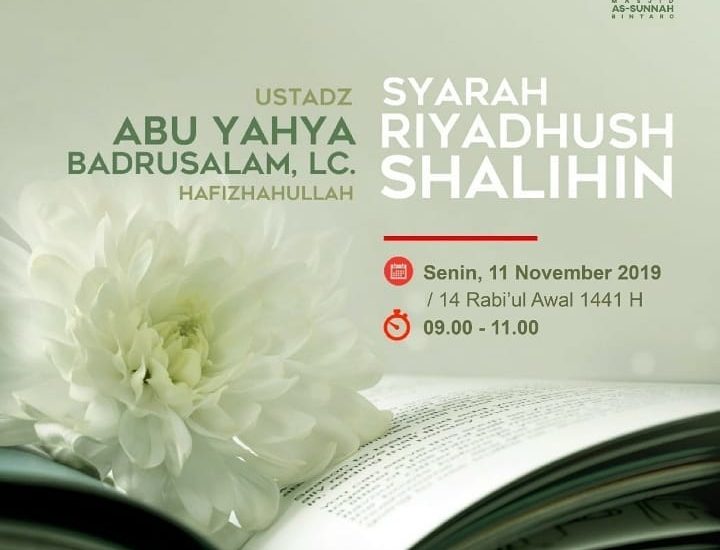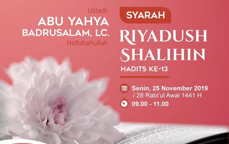 Routine Study Info Discussing RIYADHUSH SHALIHIN'S SYARAH (13th Hadith) with Ustadz Abu Yahya Badrusalam, Lc الله Monday, 25 November 2019 / 28 Rabiul Awal 1441 H 09.00 – 11.00 WIB Sunnah Bintaro Mosque Jl.Nusajaya, Pondok Ranji. Behind Bintaro Plaza....