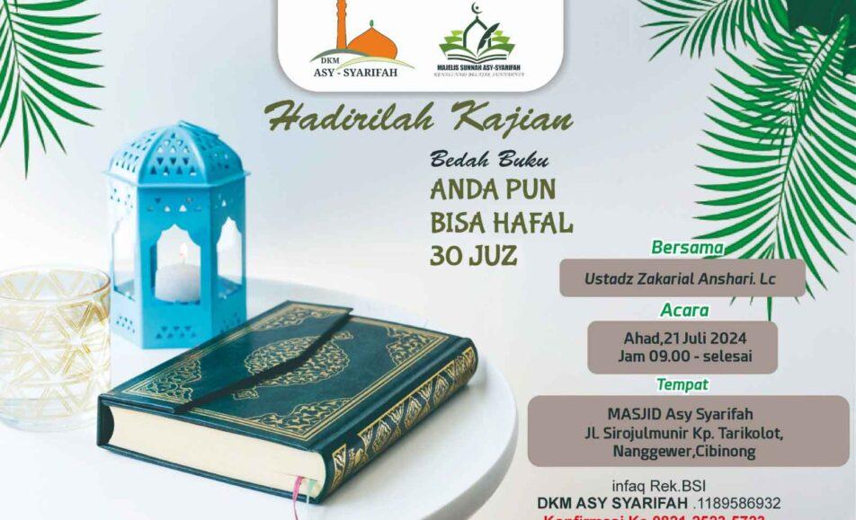 Bismillah, salah satu bukti terjaganya al-Qur’an adalah tersimpannya di dada para penghafal al-Qur’an dari berbagai penjuru dunia. Mungkinkah Anda menjadi salah satu penjaga Al-Quran? Jawabannya sangatlah mungkin. Bagaimana caranya? yuk hadiri kajian bedah buku… Anda pun Bisa Hafal 30 Juz...
