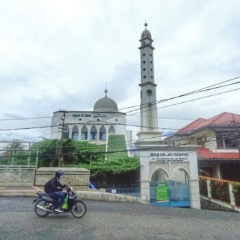 At Taufiq Mosque Bogor is located on Jl. Paledang Bogor, 100 meters west of the Botanical Gardens, adjacent to Hotel Royal, Sahira boutique hotel and McDonald's. This mosque is quite small but beautiful with an architecture that adheres to a minimalist style, a typical tropical roof, characterized by a sharp slope to anticipate rainwater., In the middle there is a dome with a diameter of 5 meters. The south and north walls are full of Islamic ornate doors and windows, tapering upwards.
