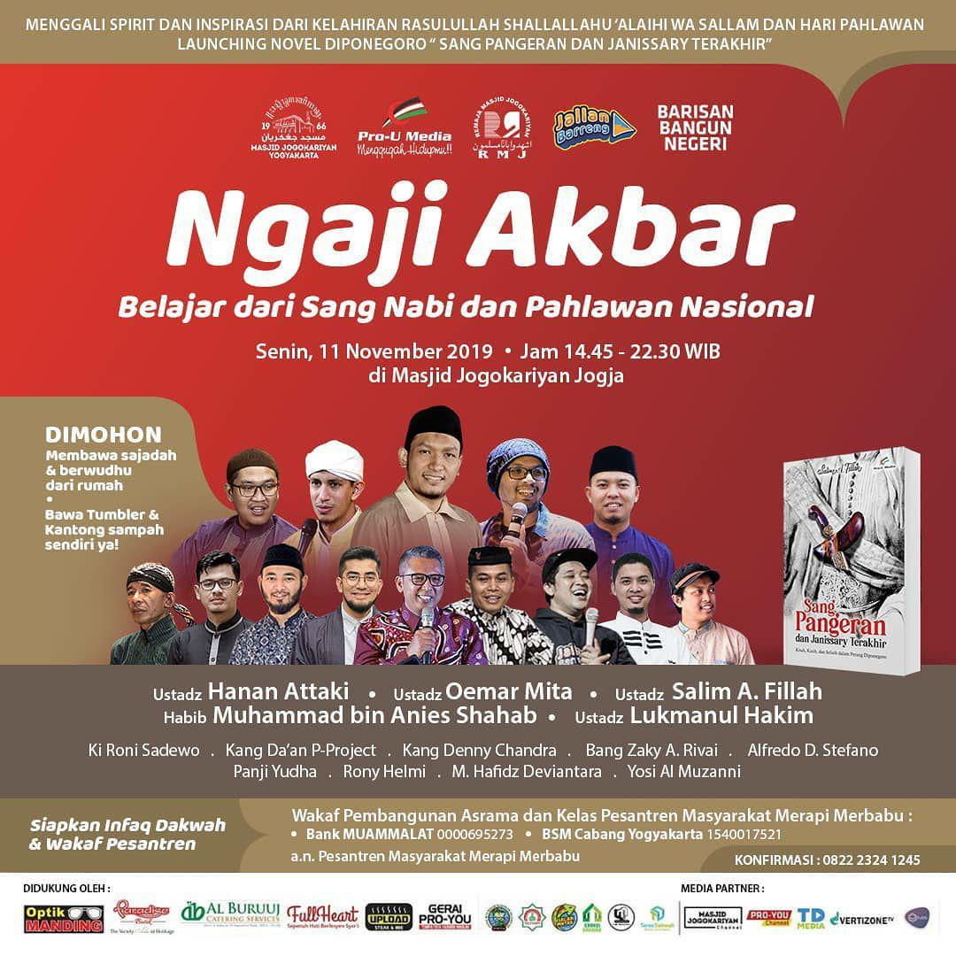 Jiwa kepahlawanan bangsa Indonesia harus terus kita kobarkan. Pangeran Diponegoro adalah salah satu sosok yang rela meninggalkan segala kemewahan dan kemegahan untuk berjuang karena Allah melawan angkara murka dan penjajahan. Di hari miladnya, sekaligus memperingati hari pahlawan yang juga bertepatan Maulid Nabi; menghayati perjuangan teladan kepahlawanan sejati Nabi Muhammad ﷺ; Masjid Jogokariyan dan Penerbit Pro-U Media mempersembahkan;