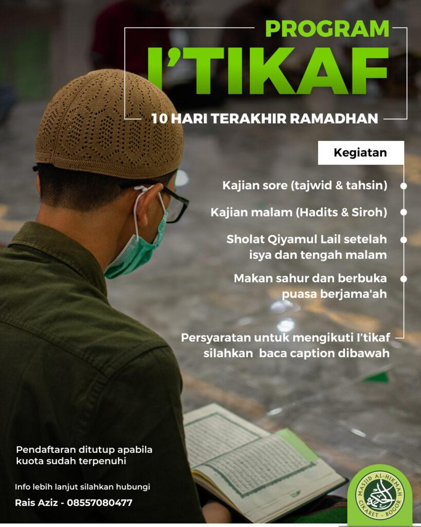 Salah satu ibadah di bulan Ramadhan yang sangat dianjurkan terutama di sepertiga bulan yang akhir yaitu ibadah i’tikaf. Oleh sebab itu, Masjid Jami’ Alhikmah menyelenggarakan Program I’tikaf pada Ramadhan 1443 H kali ini dengan batas quota 20 orang.