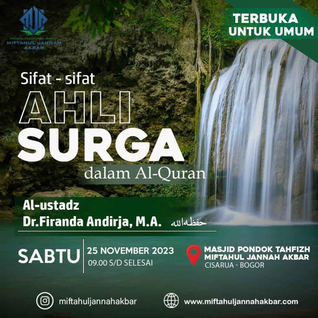 Kita tidak dapat memastikan siapa ahli surga, kecuali bila terdapat pemberitahuan dari Rasulullah ﷺ tentang orang-orang tertentu yang terpilih Allah Subhanahu wa ta’ala. Tetapi, kita dapat mempelajari sifat-sifat ahli surga yang Allah Subhanahu wa ta’ala jelaskan di dalam Alquran, sehingga kita termotivasi untuk mengamalkannya dalam kehidupan tiap hari. Oleh sebab itu mari hadiri kajiannya…