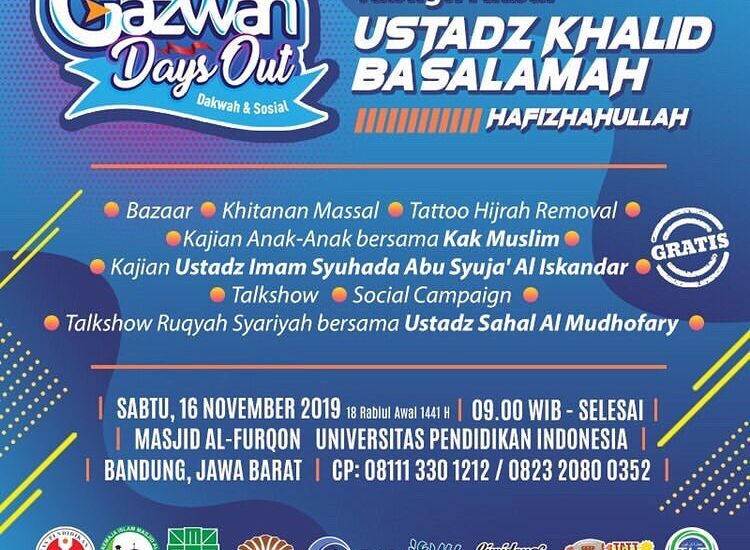 Gazwah Days Out; Dakwah dan Sosial Hadirilah Tabligh Akbar bersama: Ustadz Khalid Basalamah Hafidzahullah Ta’ala InsyaaAllah diselenggarakan pada: Sabtu, 16 November 2019 Bertempat di: Masjid Al Furqon, Universitas Pendidikan Indonesia, Bandung. Turut hadir dalam rangkaian acara: – Bazaar Makanan, Minuman...