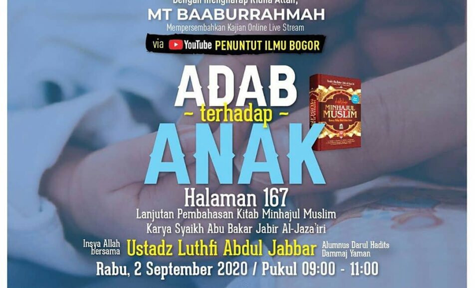 Bismillaah, KAJIAN LIVE-STREAMING MT. Baaburrahmah Bintaro T E M A : Lanjutan Minhajul Muslim Adab Terhadap Anak PEMATERI : Ustadz Luthfi Abdul Jabbar Hafizhahullah HARI / TANGGAL : Rabu, 2 September 2020 14 Muharam 1442 H WAKTU : 09.00WIB –...