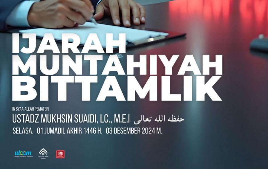 بسم الله الرحمن الرحيم Ijarah Muntahiyah Bittamlik adalah akad sewa-menyewa yang berakhir dengan pemindahan kepemilikan barang dari pemberi sewa kepada penyewa. Pemindahan kepemilikan ini bisa dilakukan melalui akad jual beli atau hibah. Ijarah Muntahiyah Bittamlik InsyaaAllah bersamaUstadz Mukhsin Suaidi, Lc., M.E.I...