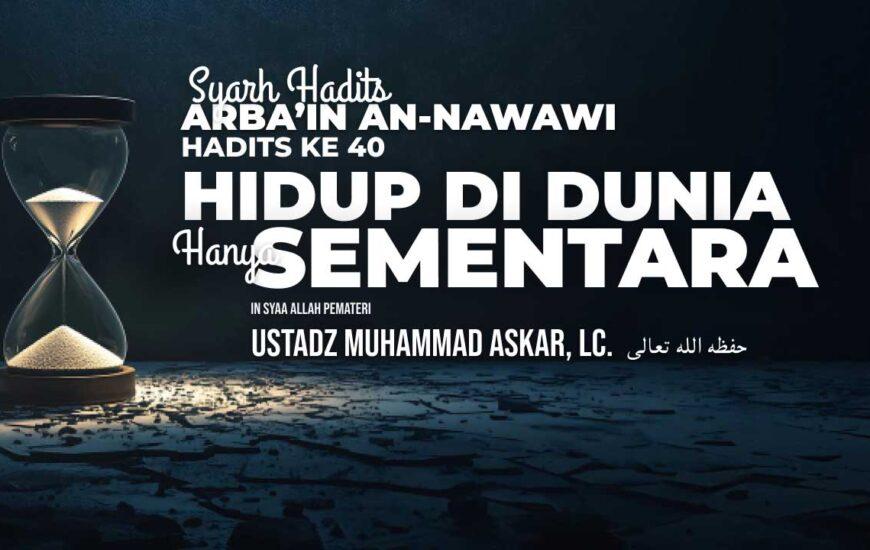 Hadits Arbain ke-40 membahas bahwa kita hidup di dunia ini hanya sementara dan sebentar. Dari Ibnu ‘Umar radhiyallahu ‘anhuma berkata: Rasulullah shallallahu ‘alaihi wa sallam memegang kedua pundakku, lalu bersabda, “Jadilah engkau di dunia seperti orang asing atau seorang musafir.” Ibnu ‘Umar radhiyallahu ‘anhuma berkata, “Jika...