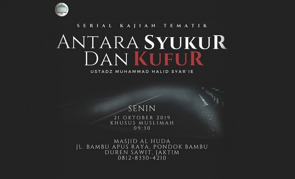 Serial Kajian Tematik Khusus Muslimah Antara Syukur dan Kufur Bersama Ustadz Muhammad Halid Syar’i Senin, 21 Oktober 2019 pukul 09:30 Masjid Al Huda Jl.Bambu Apus Raya, Pondok Bambu Duren Sawit, Jakarta Timur