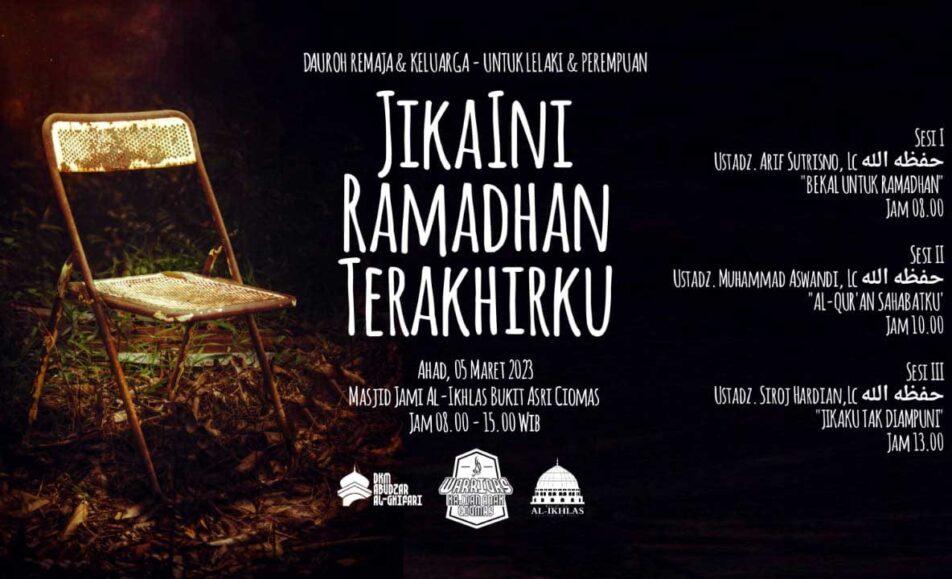 Bismillah,Assalamualaikum warahmatullahi wabarakatu. Insyaallah akan di adakan Dauroh Remaja dan Keluarga dengan tema: Jika Ini Ramadhan Terakhirku Yuk kita dateng barengan sekeluarga mempersiapkan Ramadhan tahun ini agar lebih optimal lagi. Kapan? ⏰ Ahad, 5 Maret 2023 🕋 Masjid Jami Al-Ikhlas...